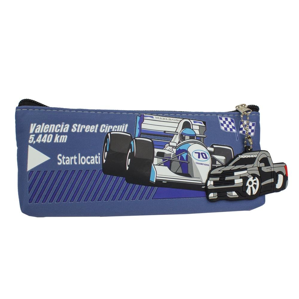 حافظة أقلام عليها رسومات لسيارات سباق وعبارات مثل "Valencia Street Circuit 5,440 km" و "Start locati".